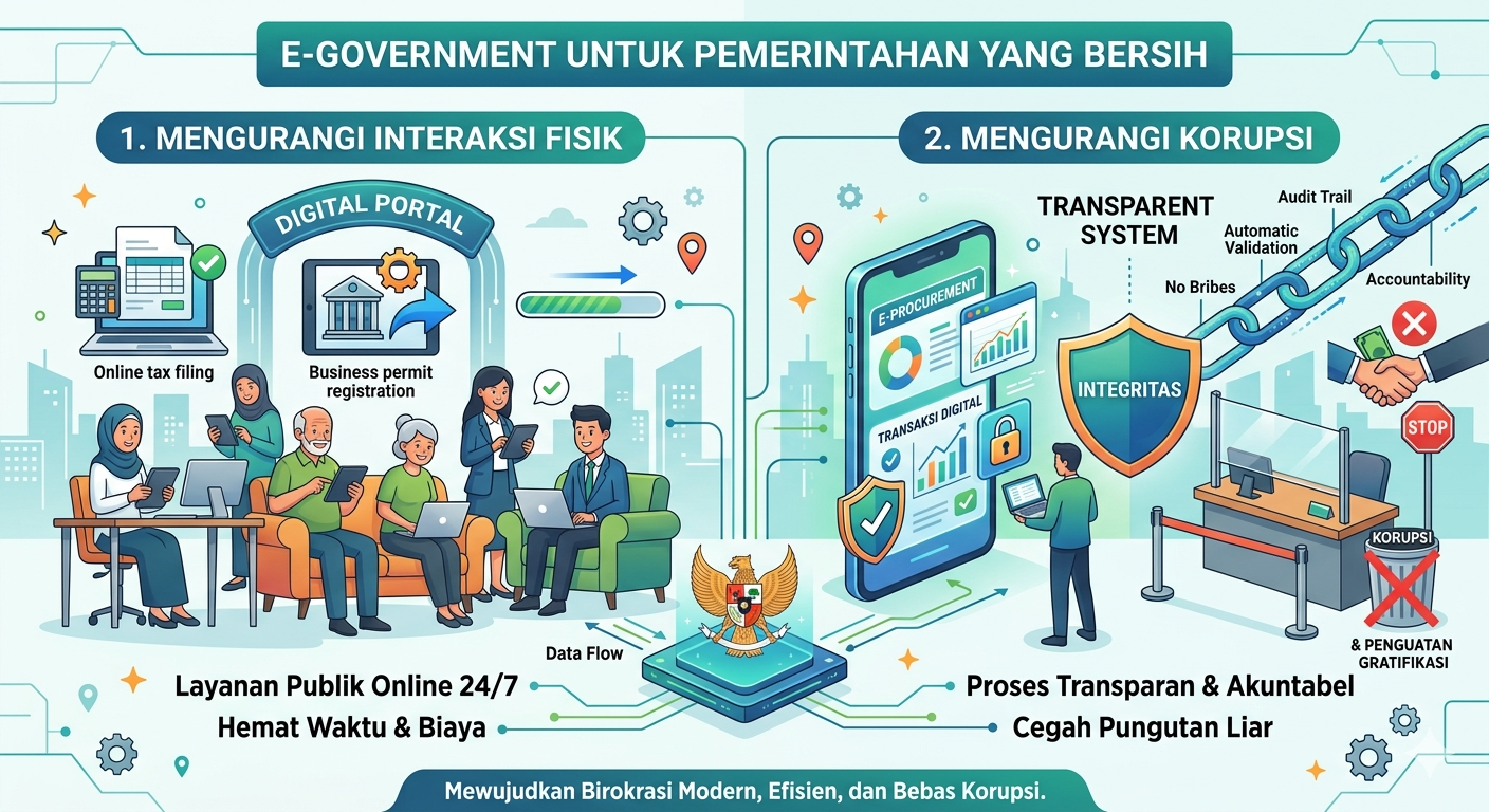 Seiring dengan perkembangan teknologi digital, konsep e-government atau pemerintahan berbasis elektronik hadir sebagai solusi inovatif untuk meningkatkan kualitas pelayanan publik. E-government memungkinkan berbagai layanan dilakukan secara daring tanpa harus melalui tatap muka langsung. Sistem ini mencakup berbagai layanan seperti administrasi kependudukan, perizinan usaha, pembayaran pajak, hingga pengadaan barang dan jasa secara elektronik. Dengan sistem yang terintegrasi dan berbasis teknologi, e-government diyakini mampu meminimalisir peluang terjadinya praktik korupsi (United Nations, 2022).