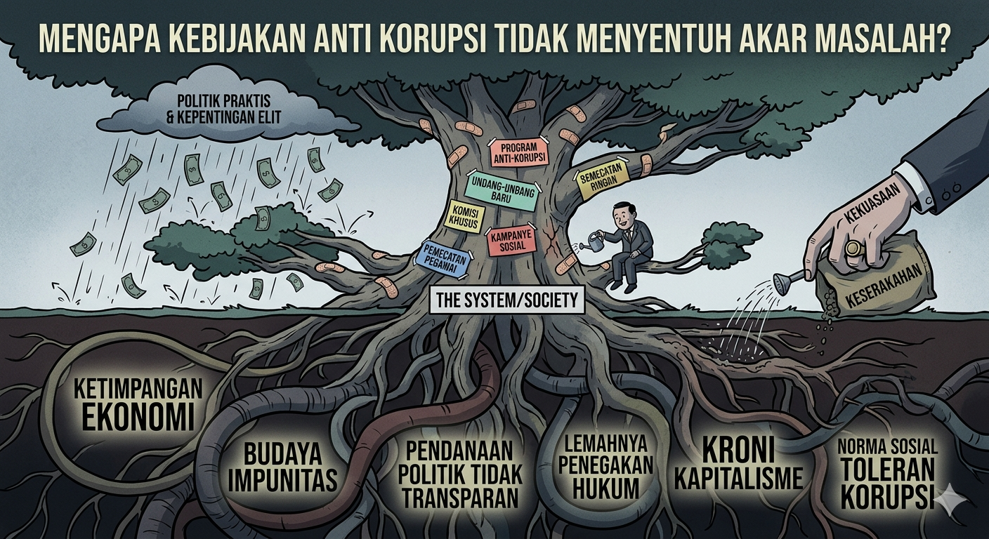 Kebijakan anti korupsi tidak menyentuh akar masalah karena terlalu berfokus pada penindakan hukum (symptomatic treatment), sementara faktor struktural, budaya, dan kolektif yang menjadi penyebab utama korupsi justru kurang diperhatikan secara serius dan sistematis.