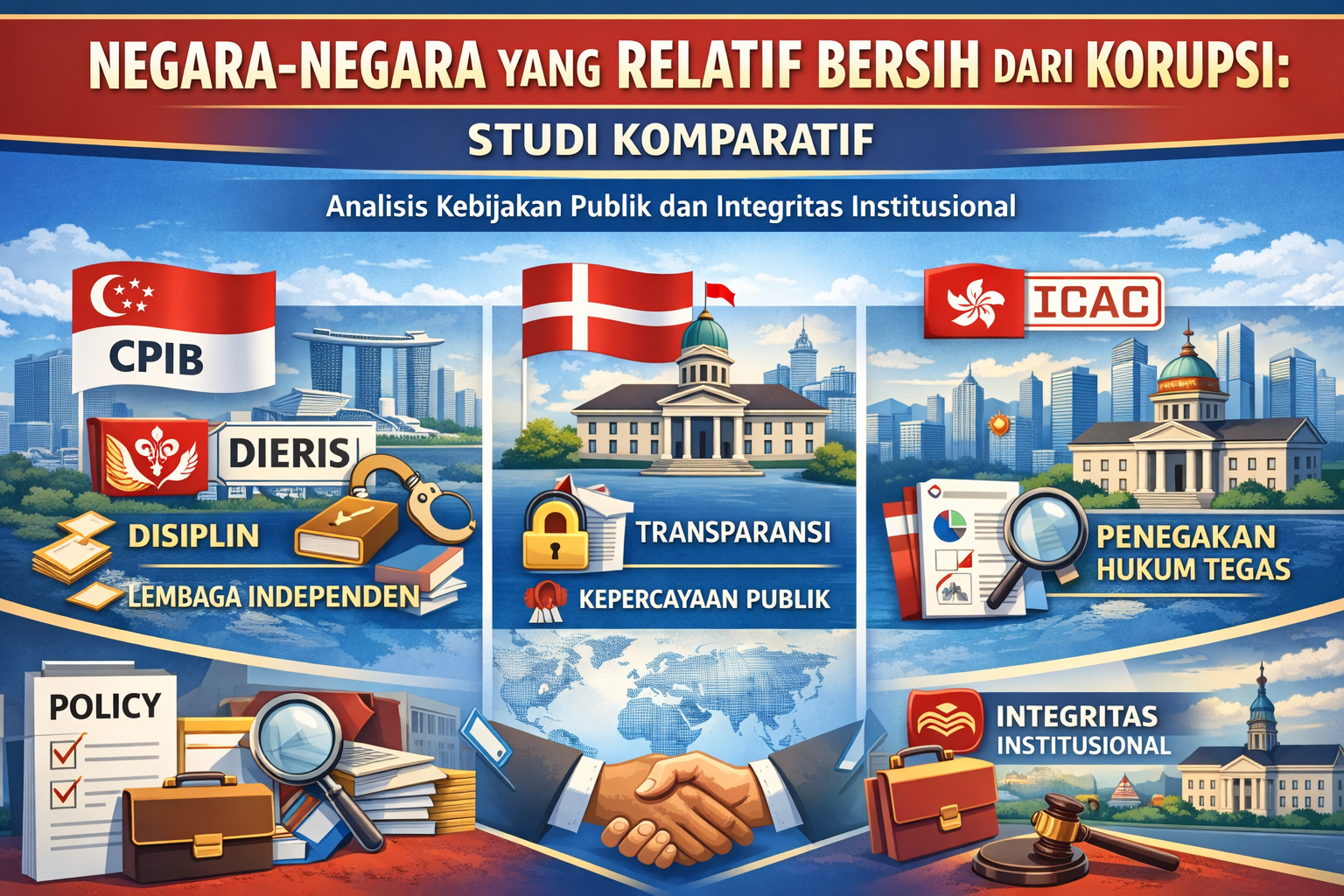 Namun, di tengah krisis integritas global tersebut, terdapat sekelompok negara yang secara konsisten mampu mempertahankan predikat sebagai entitas yang relatif bersih dari korupsi. Negara-negara seperti Denmark di Eropa Utara dan Singapura di Asia Tenggara menonjol sebagai anomali positif dengan skor indeks persepsi korupsi yang sangat tinggi (Transparency International, 2024). Keberhasilan mereka memunculkan pertanyaan mendasar mengenai efektivitas model tata kelola yang mereka terapkan. Latar belakang penulisan ini berfokus pada urgensi untuk membedah strategi-strategi yang memungkinkan negara-negara tersebut membangun sistem imun terhadap praktik lancung. Memahami apakah keberhasilan tersebut merupakan hasil dari evolusi budaya yang panjang atau rekayasa institusional yang sengaja diciptakan menjadi sangat relevan bagi diskursus pembangunan global saat ini.