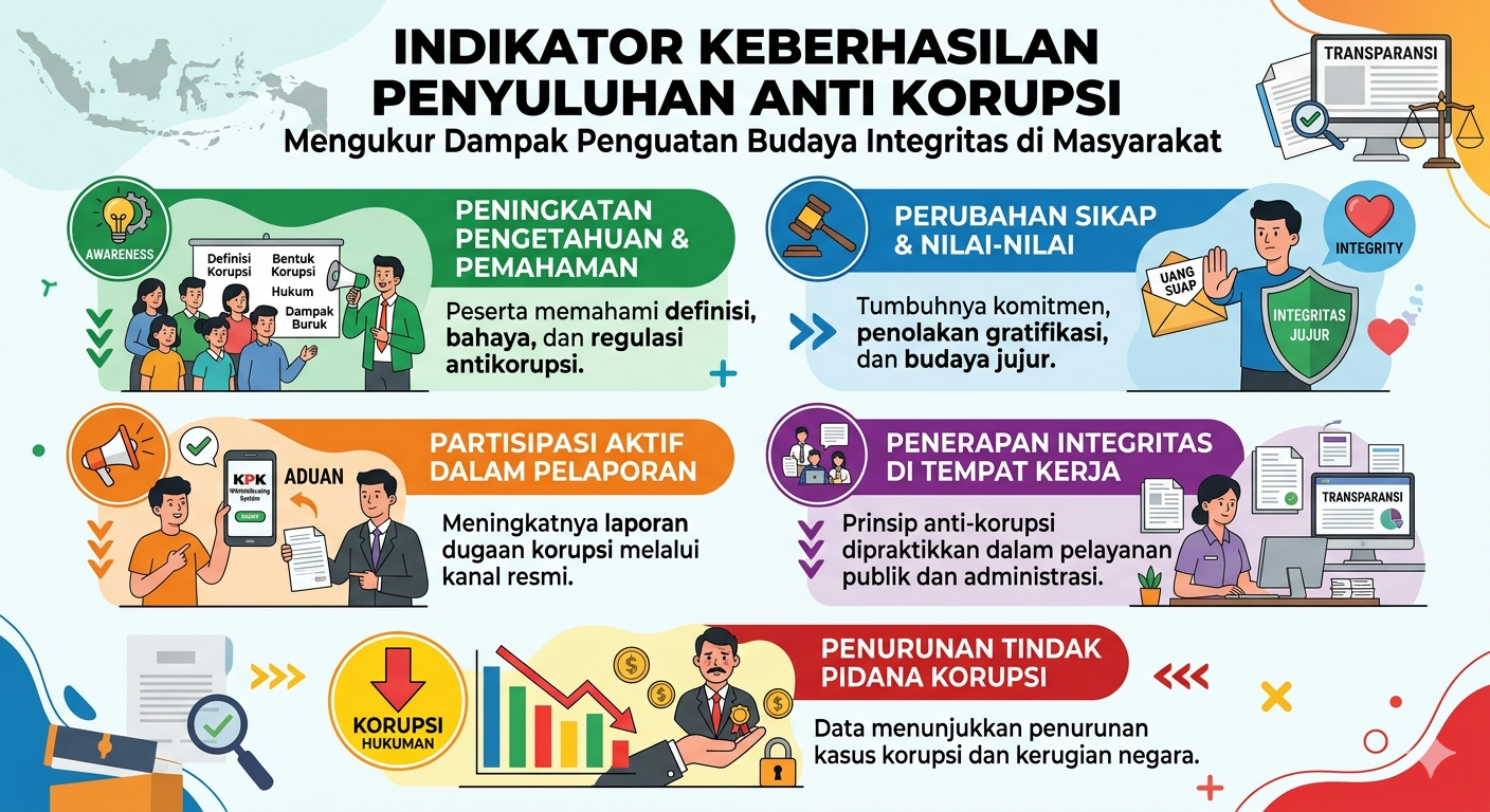 Kesimpulan utama dari esai ini menegaskan bahwa keberhasilan penyuluhan antikorupsi merupakan sebuah pencapaian multidimensi yang tidak dapat direduksi hanya pada angka statistik kehadiran atau pemenuhan target administratif semata. Sebagai ringkasan dari seluruh pembahasan, indikator keberhasilan yang komprehensif harus mampu menjawab rumusan masalah dengan mengintegrasikan tiga ranah utama perubahan perilaku manusia: kognitif, afektif, dan psikomotorik. Pada ranah kognitif, keberhasilan ditandai dengan peningkatan tajam pemahaman peserta terhadap seluk-beluk regulasi dan identifikasi modus operandi korupsi yang kian canggih. Namun, penguasaan pengetahuan tersebut harus diikuti oleh transformasi afektif berupa internalisasi nilai-nilai integritas yang mendalam, di mana muncul kesadaran etis dan rasa tanggung jawab moral untuk menolak segala bentuk kecurangan. Tanpa adanya keterikatan emosional terhadap nilai kejujuran, pengetahuan yang dimiliki individu hanya akan menjadi instrumen untuk mencari celah hukum yang baru.