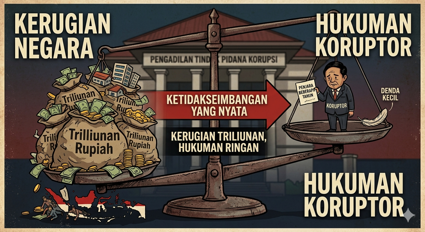 Korupsi yang menyebabkan kerugian keuangan negara merupakan persoalan serius di Indonesia karena efeknya langsung menurunkan kapasitas fiskal negara untuk membiayai pelayanan publik dan pembangunan. Meskipun undang-undang anti-korupsi sudah mengatur sanksi pidana dan mekanisme pengembalian kerugian, praktik putusan pengadilan dan efektivitas pemulihan aset menunjukkan ketidakkonsistenan antara besaran kerugian negara dan bobot hukuman yang dijatuhkan. Hal ini menimbulkan pertanyaan tentang proporsionalitas hukuman, efek jera, dan pemulihan aset negara sebagai prioritas penegakan hukum. (Badan Pembinaan Hukum Nasional)