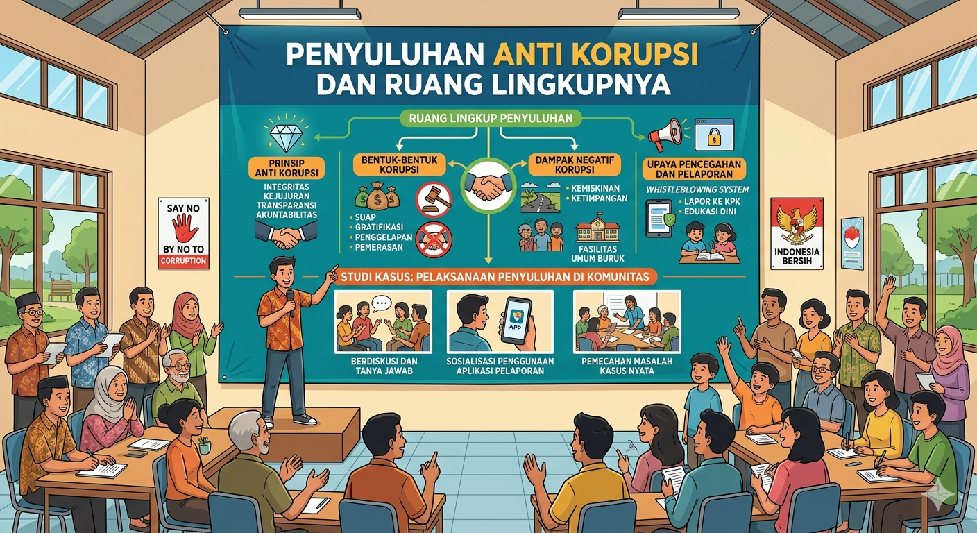 Ruang lingkup penyuluhan anti korupsi mencakup beberapa dimensi yang saling terkait. Pertama, dimensi kognitif, yakni pemahaman tentang bentuk-bentuk korupsi, regulasi yang mengaturnya, dan mekanisme pelaporan. Kedua, dimensi afektif, yang berkaitan dengan pembentukan nilai-nilai integritas, kejujuran, dan tanggung jawab sosial. Ketiga, dimensi behavioral, yaitu kemampuan untuk mengambil tindakan nyata seperti menolak suap, melaporkan pelanggaran, atau berpartisipasi dalam pengawasan anggaran publik (Widodo & Kurniawan, 2021). Ketiga dimensi ini harus digarap secara serentak agar penyuluhan tidak berhenti pada level pengetahuan semata.