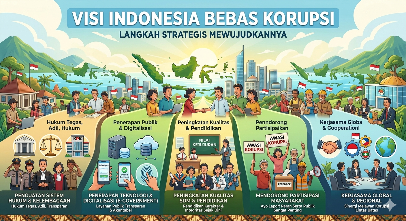 Korupsi merupakan salah satu permasalahan serius yang telah lama mengakar dan menjadi tantangan besar dalam perjalanan pembangunan di Indonesia. Praktik korupsi tidak hanya berdampak pada kerugian keuangan negara, tetapi juga menimbulkan efek domino yang luas, seperti terhambatnya pertumbuhan ekonomi, menurunnya kualitas pelayanan publik, meningkatnya ketimpangan sosial, serta merosotnya kepercayaan masyarakat terhadap lembaga pemerintahan (Rose-Ackerman, 1999). Dalam berbagai sektor, mulai dari birokrasi, politik, hingga pelayanan publik, korupsi kerap terjadi dalam berbagai bentuk, baik yang bersifat kecil (petty corruption) maupun yang berskala besar (grand corruption). Kondisi ini menunjukkan bahwa korupsi bukan sekadar masalah hukum, tetapi juga persoalan sistemik yang berkaitan dengan budaya, moralitas, dan tata kelola pemerintahan (Andvig & Fjeldstad, 2001). Di tengah upaya pembangunan nasional yang berkelanjutan, Indonesia memiliki visi besar untuk menjadi negara yang maju, adil, dan sejahtera. Namun, visi tersebut akan sulit tercapai apabila praktik korupsi masih terus berlangsung. Oleh karena itu, muncul gagasan dan komitmen untuk mewujudkan Indonesia yang bebas dari korupsi sebagai bagian penting dari reformasi dan perbaikan tata kelola negara. Visi Indonesia bebas korupsi tidak hanya menjadi tanggung jawab pemerintah, tetapi juga memerlukan peran aktif seluruh elemen masyarakat, termasuk sektor swasta, lembaga pendidikan, dan masyarakat sipil. Kesadaran akan pentingnya integritas, transparansi, dan akuntabilitas harus ditanamkan sejak dini agar tercipta budaya anti-korupsi yang kuat dan berkelanjutan (OECD, 2020).