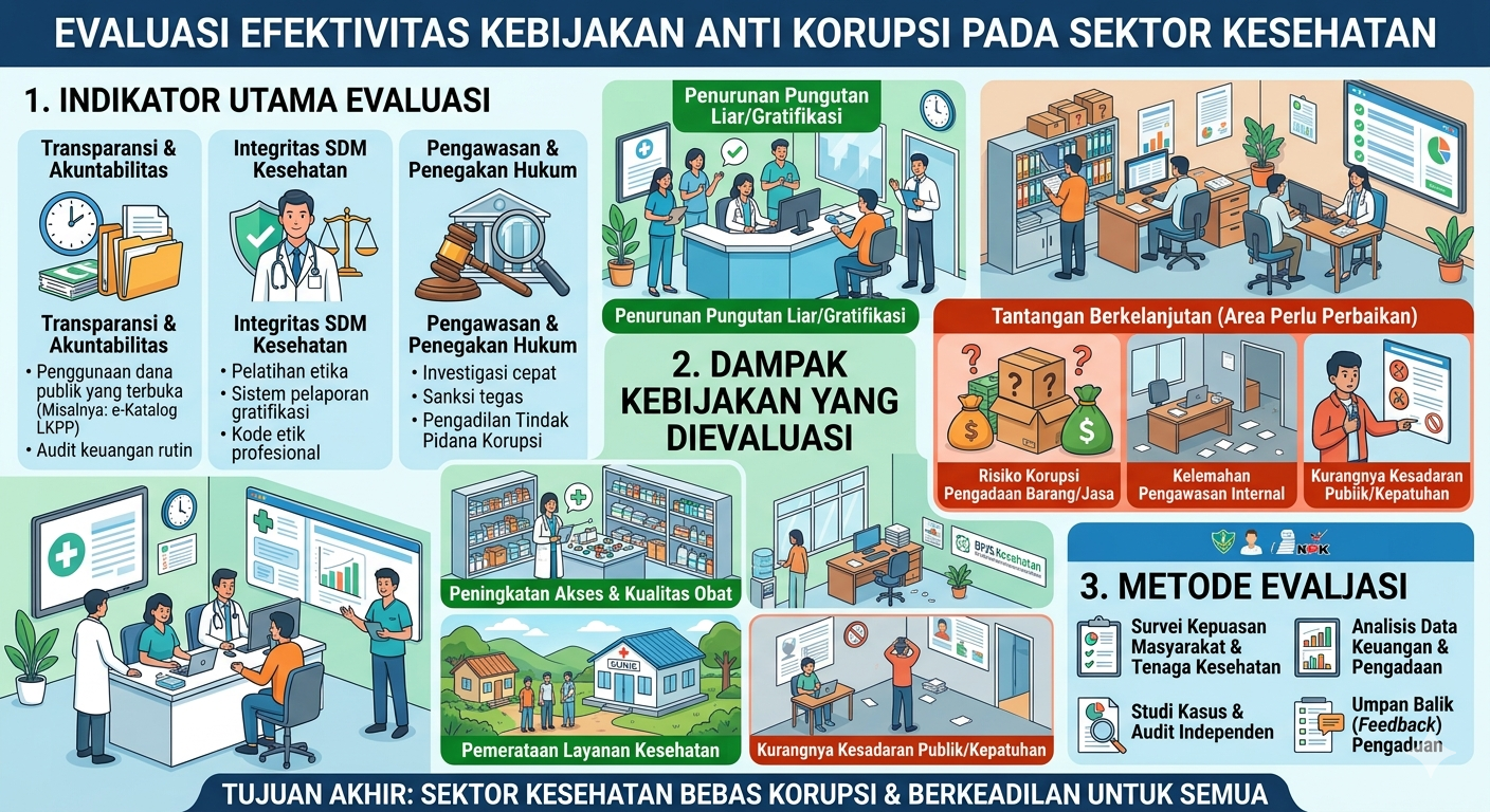 Evaluasi efektivitas kebijakan anti korupsi di sektor kesehatan Indonesia dapat dilakukan melalui beberapa indikator: (a) tren Indeks Persepsi Korupsi (IPK), (b) Indeks Perilaku Anti Korupsi (IPAK), (c) hasil evaluasi implementasi kebijakan di lapangan, dan (d) perbandingan dengan standar internasional.