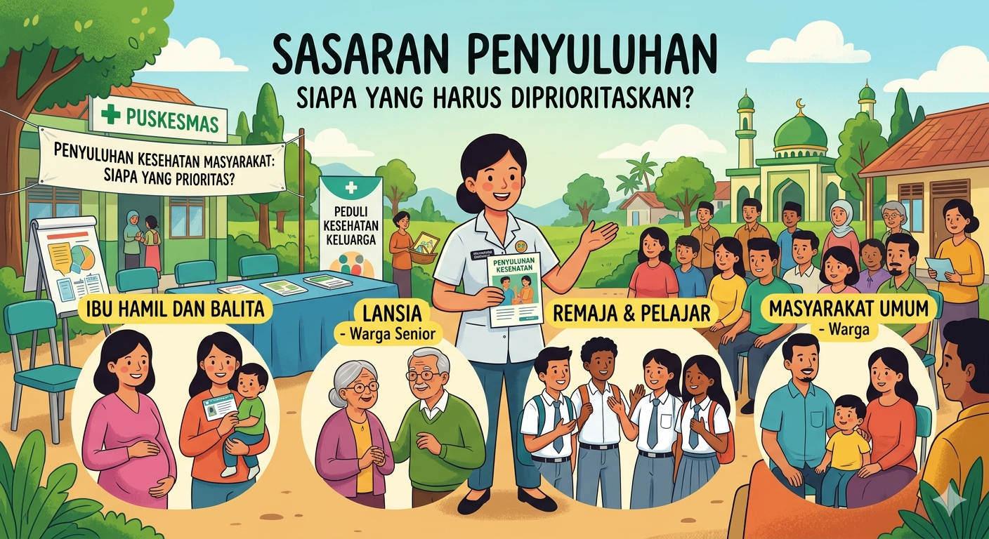 Berdasarkan uraian di atas, dapat ditegaskan bahwa sasaran penyuluhan yang harus diprioritaskan adalah kelompok rentan, kelompok berisiko tinggi, serta kelompok dengan akses informasi kesehatan yang rendah. Prioritas ini penting karena kelompok tersebut memiliki kebutuhan kesehatan yang lebih mendesak, dampak masalah kesehatan yang lebih besar, serta potensi manfaat yang lebih tinggi dari intervensi penyuluhan. Penyuluhan yang efektif bukan hanya soal menyampaikan informasi kepada sebanyak mungkin orang, tetapi tentang memastikan bahwa informasi tersebut sampai kepada orang yang paling membutuhkan