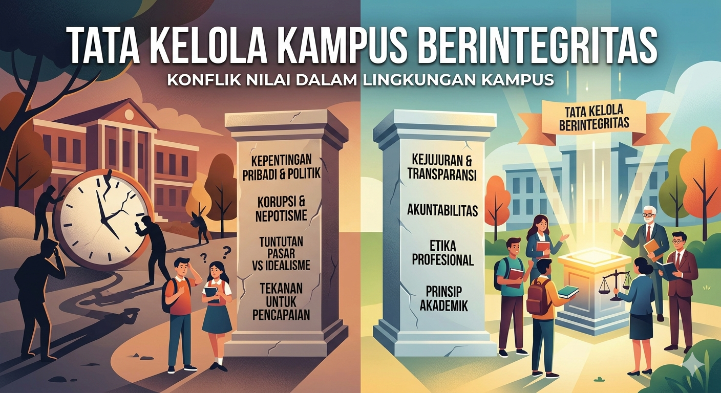 Kampus yang berintegritas hanya dapat terwujud apabila tata kelola institusi dibangun di atas fondasi transparansi, akuntabilitas, dan penegakan etika yang konsisten bukan sekadar slogan dalam dokumen visi-misi, melainkan praktik nyata yang tercermin dalam setiap keputusan kelembagaan. Konflik nilai yang terjadi di lingkungan kampus saat ini bukanlah keniscayaan yang harus diterima, melainkan cerminan dari kegagalan sistemik dalam menginternalisasi nilai-nilai akademik yang autentik (Jensen & Meckling, 1976). Untuk itu, reformasi tata kelola kampus yang komprehensif menyentuh aspek struktural, kultural, dan individual merupakan keharusan mendesak yang tidak boleh ditunda lebih lama.