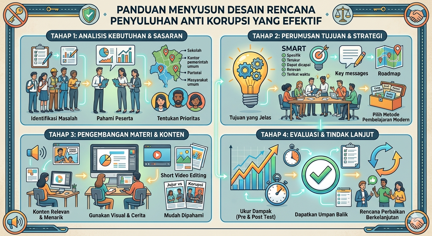 Perancangan desain penyuluhan anti korupsi yang efektif dimulai dari tahap analisis kebutuhan sasaran (need assessment). Tahap ini melibatkan identifikasi mendalam tentang karakteristik demografis sasaran, tingkat pengetahuan awal tentang korupsi, konteks sosial-budaya yang melingkupi, serta permasalahan korupsi spesifik yang relevan dengan kehidupan sehari-hari mereka. Tanpa analisis kebutuhan yang komprehensif, program penyuluhan berpotensi besar menjadi tidak relevan dan tidak menyentuh akar permasalahan yang sesungguhnya.