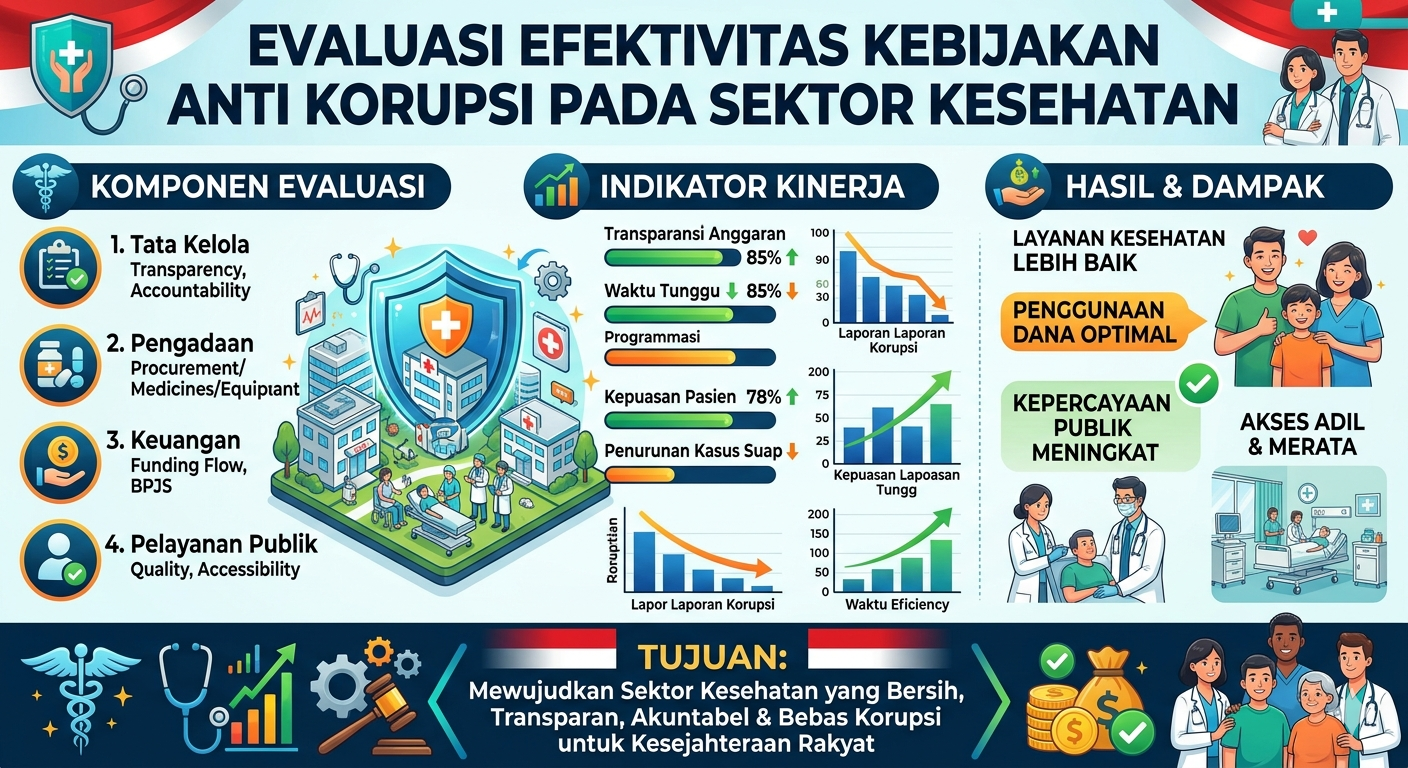 Anti korupsi adalah seperangkat kebijakan, aturan, dan tindakan yang dirancang untuk mencegah, mendeteksi, dan menindak penyalahgunaan wewenang demi keuntungan pribadi. Dalam konteks sektor kesehatan, anti korupsi mencakup transparansi pengadaan, akuntabilitas anggaran, pengawasan klaim, serta pemanfaatan teknologi digital untuk mengurangi peluang manipulasi data dan fraud. Efektivitas kebijakan dapat dilihat dari kemampuan aturan tersebut menurunkan peluang korupsi, memperbaiki tata kelola, dan meningkatkan kepercayaan publik terhadap layanan kesehatan (Pusat Widyagama, 2025).