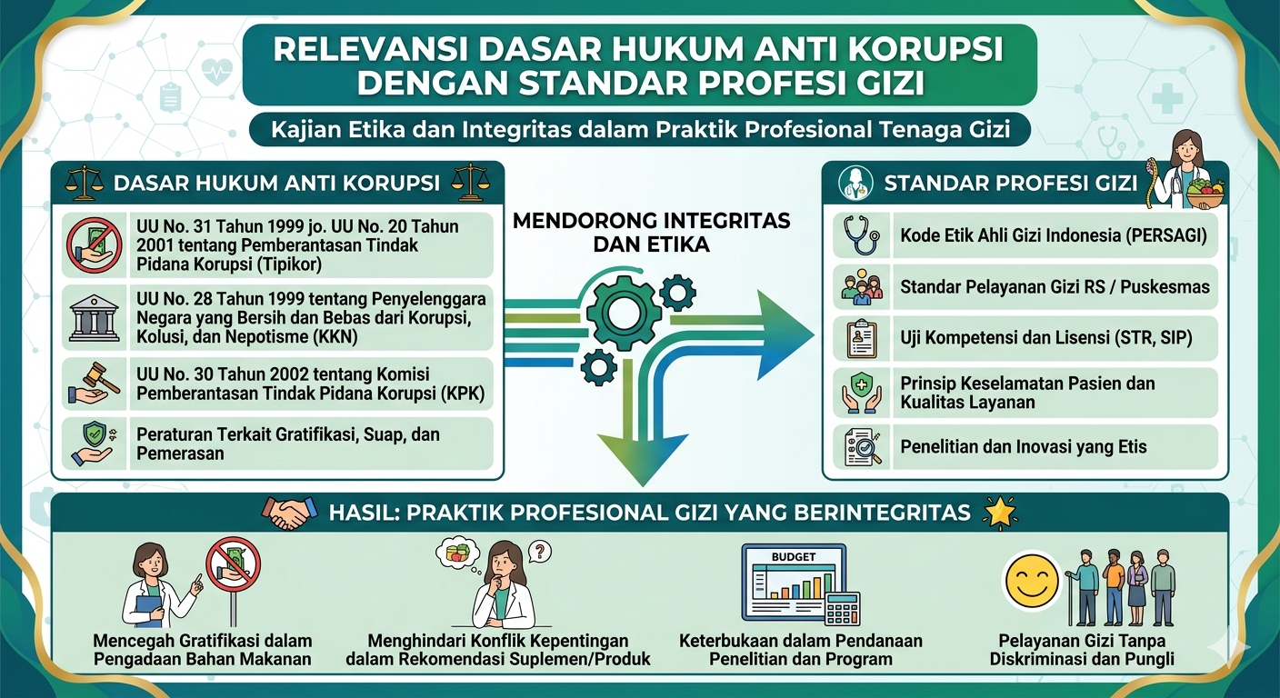 Indonesia telah memiliki kerangka hukum yang komprehensif dalam upaya pemberantasan korupsi, termasuk Undang-Undang Nomor 31 Tahun 1999 yang kemudian diubah dengan Undang-Undang Nomor 20 Tahun 2001 tentang Pemberantasan Tindak Pidana Korupsi. Di sisi lain, profesi gizi memiliki standar profesionalisme tersendiri yang diatur melalui peraturan perundang-undangan di bidang kesehatan, serta kode etik yang dikeluarkan oleh Persatuan Ahli Gizi Indonesia (PERSAGI). Pertanyaan yang muncul adalah seberapa jauh kedua perangkat normatif ini saling berkaitan dan saling mendukung satu sama lain.