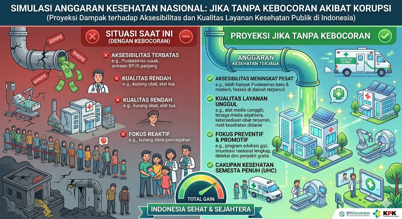 Simulasi yang dilakukan dalam esai ini secara konsisten menunjukkan bahwa kebocoran anggaran kesehatan akibat korupsi—yang diestimasi konservatif pada kisaran Rp 10-18 triliun per tahun—merupakan kehilangan besar bagi kapasitas sistem kesehatan Indonesia. Dalam skenario hipotetis tanpa korupsi, dana yang dipulihkan mampu memperluas cakupan JKN bagi hampir 10 juta jiwa, membangun ratusan Puskesmas baru, serta menjamin ketersediaan obat esensial di seluruh pelosok negeri.